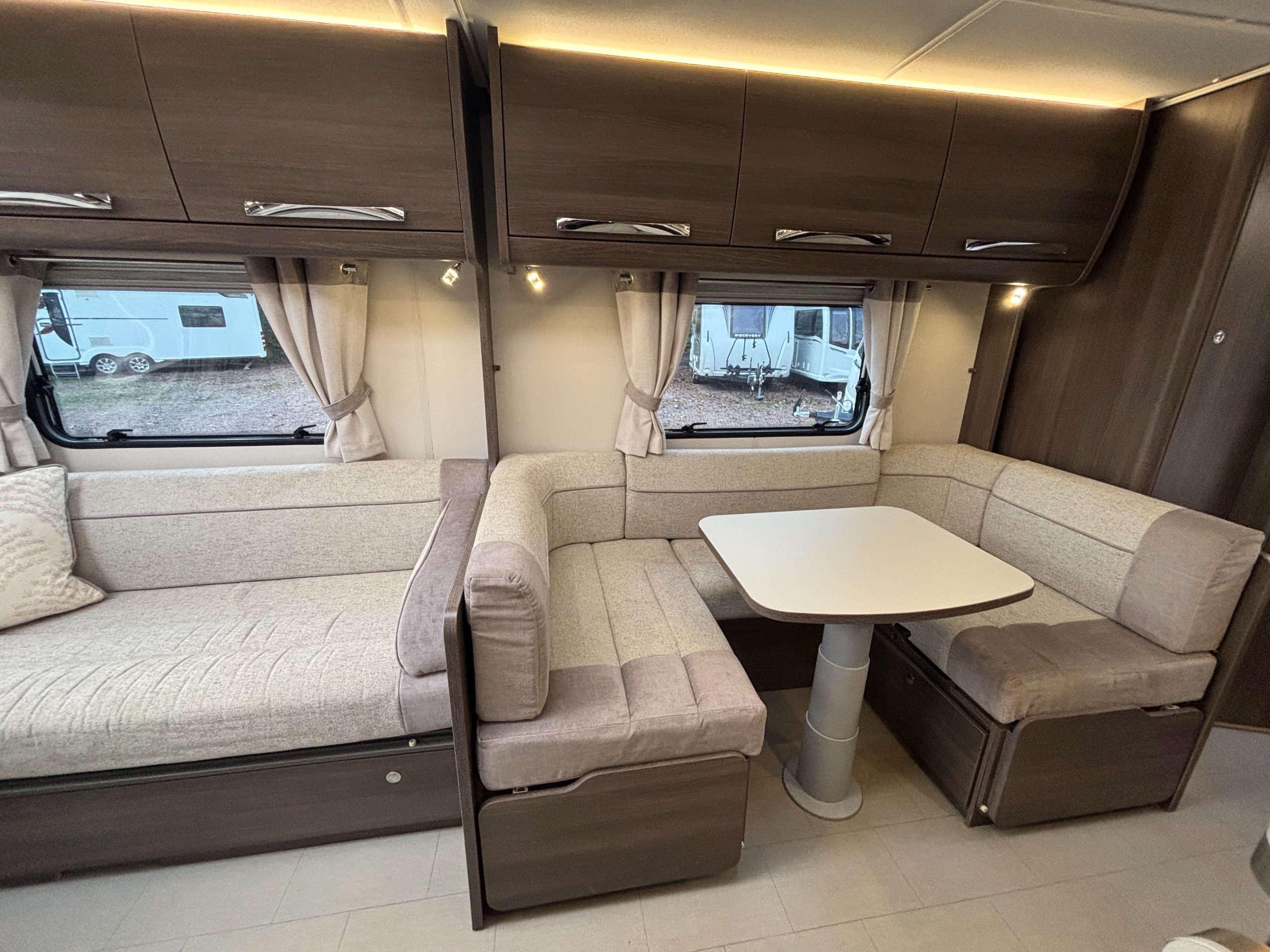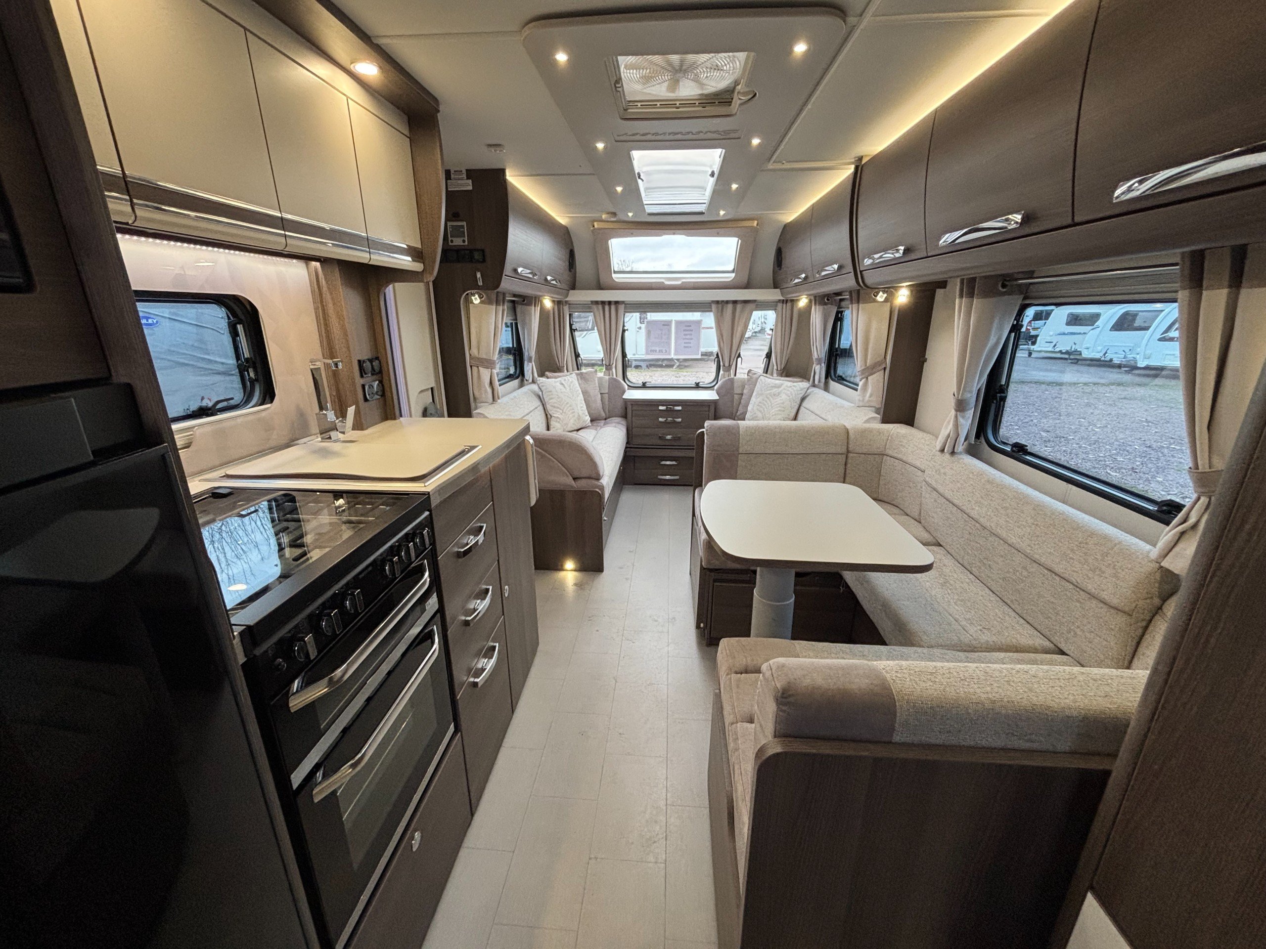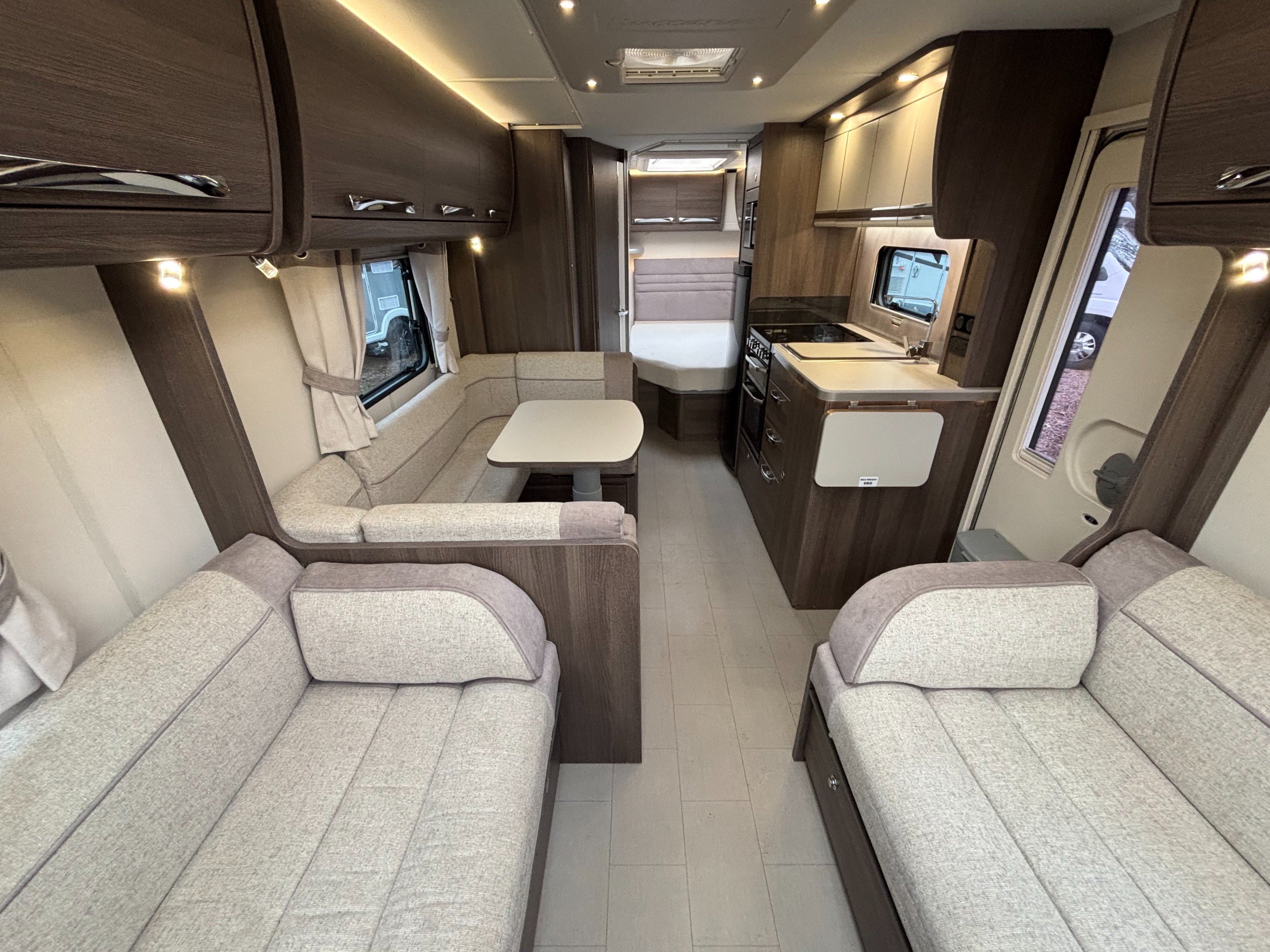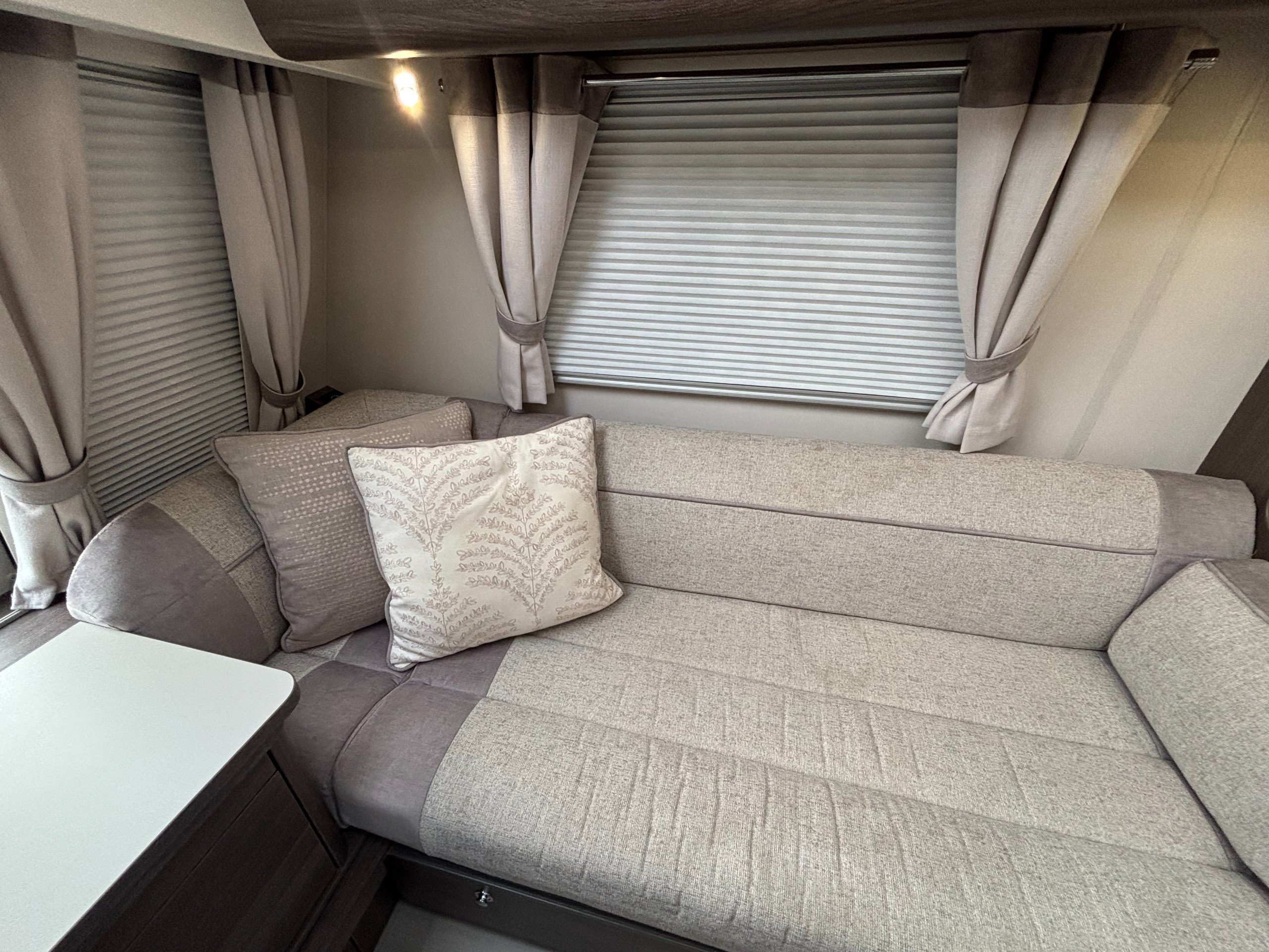 A high specification 6 berth including a large side dinette, fixed bed and corner washroom with separate shower.