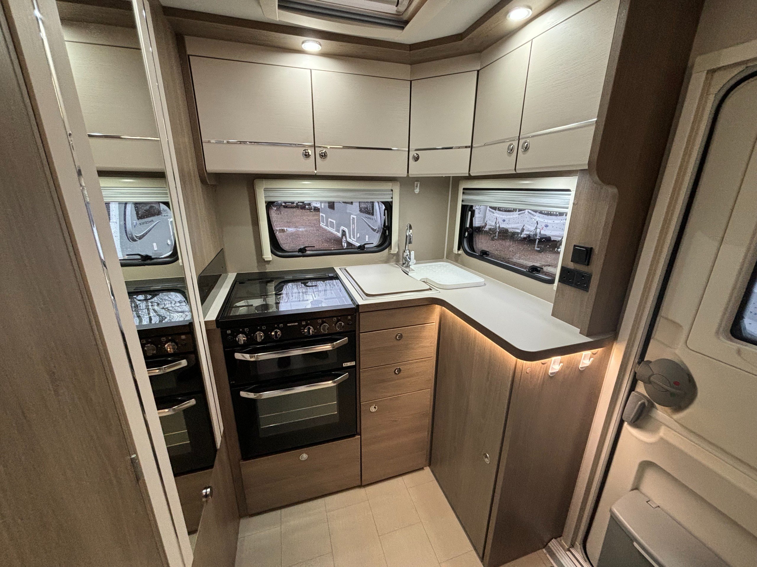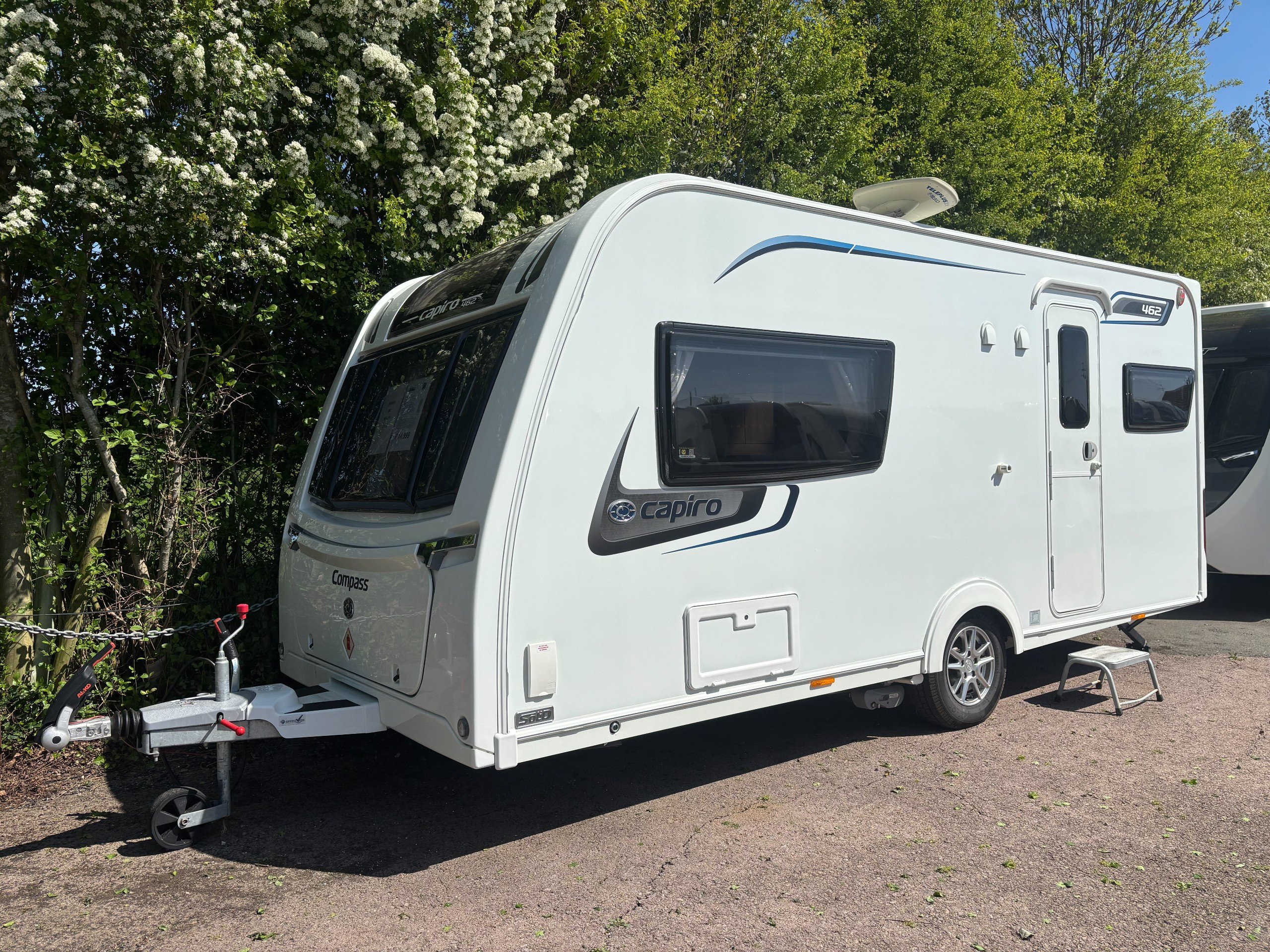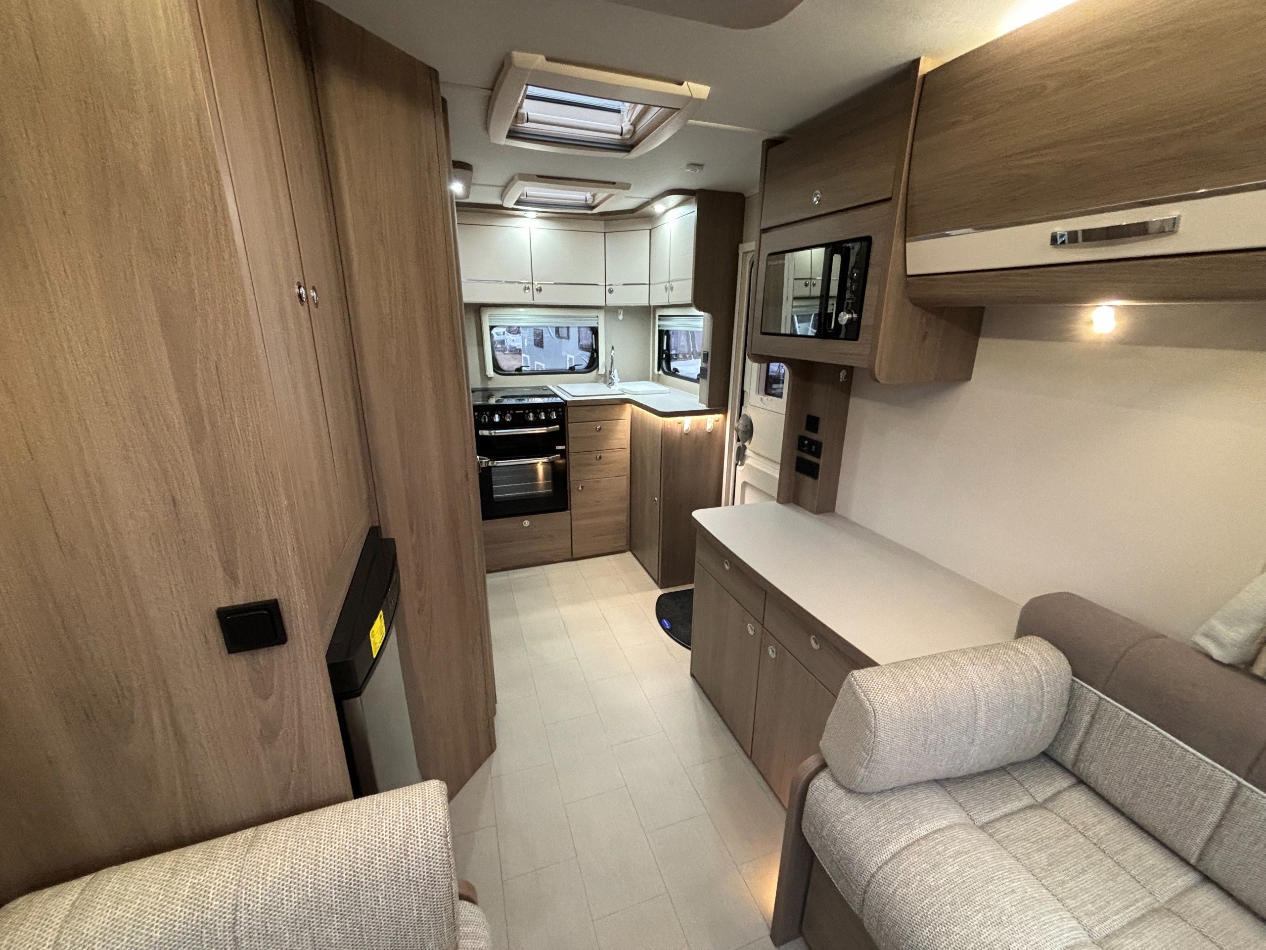 A single axle caravan with an end kitchen and fitted motor mover.