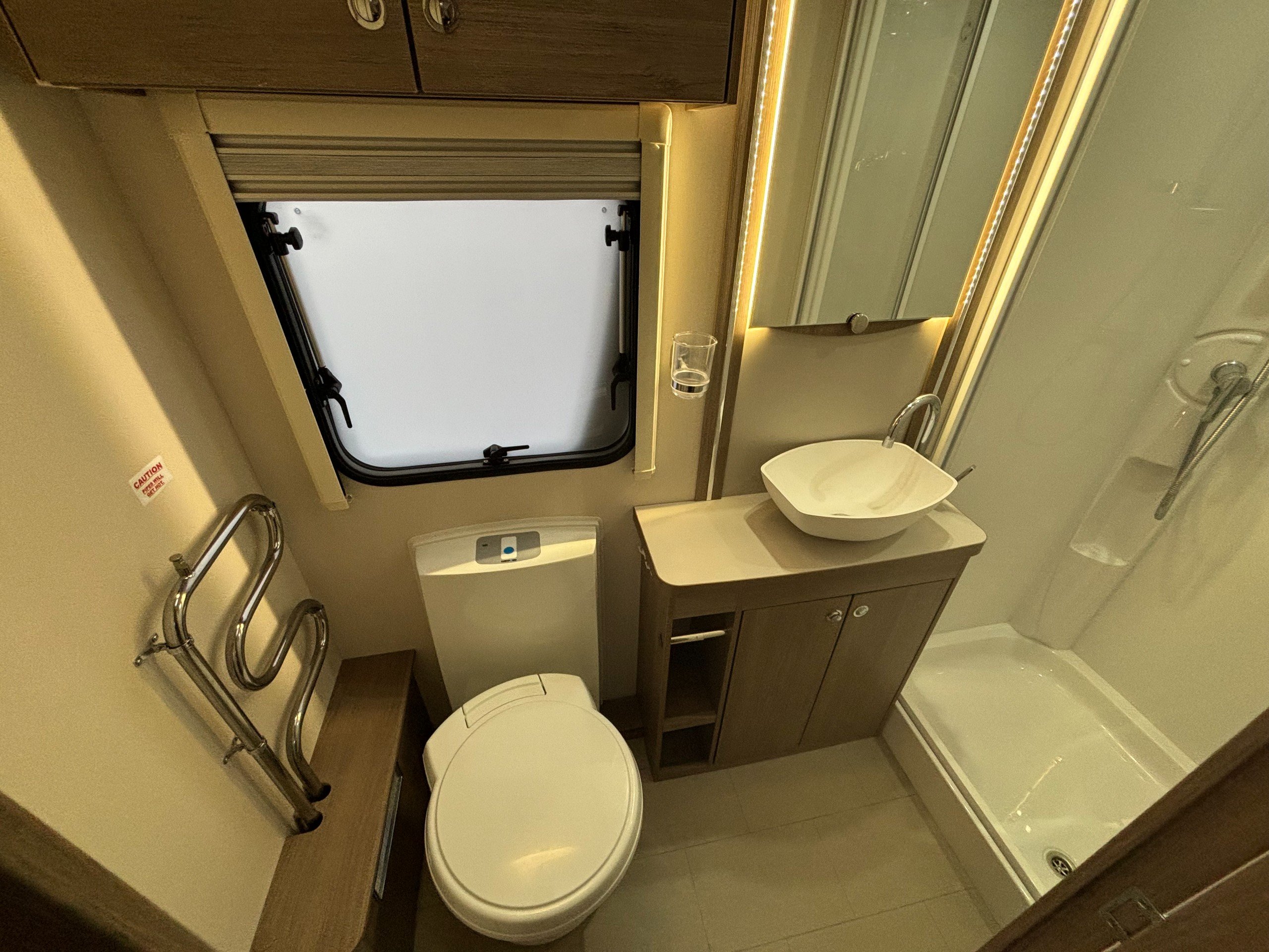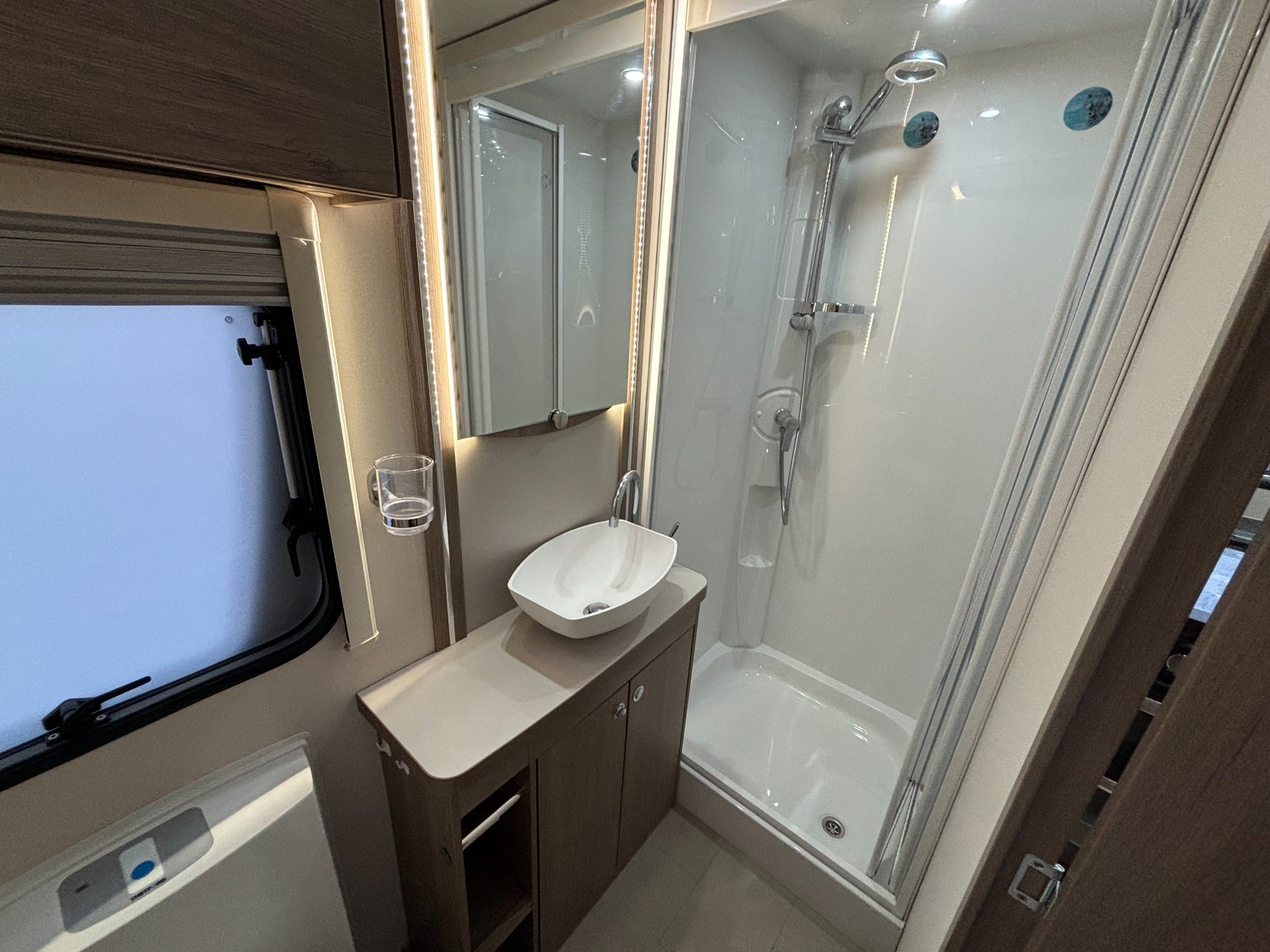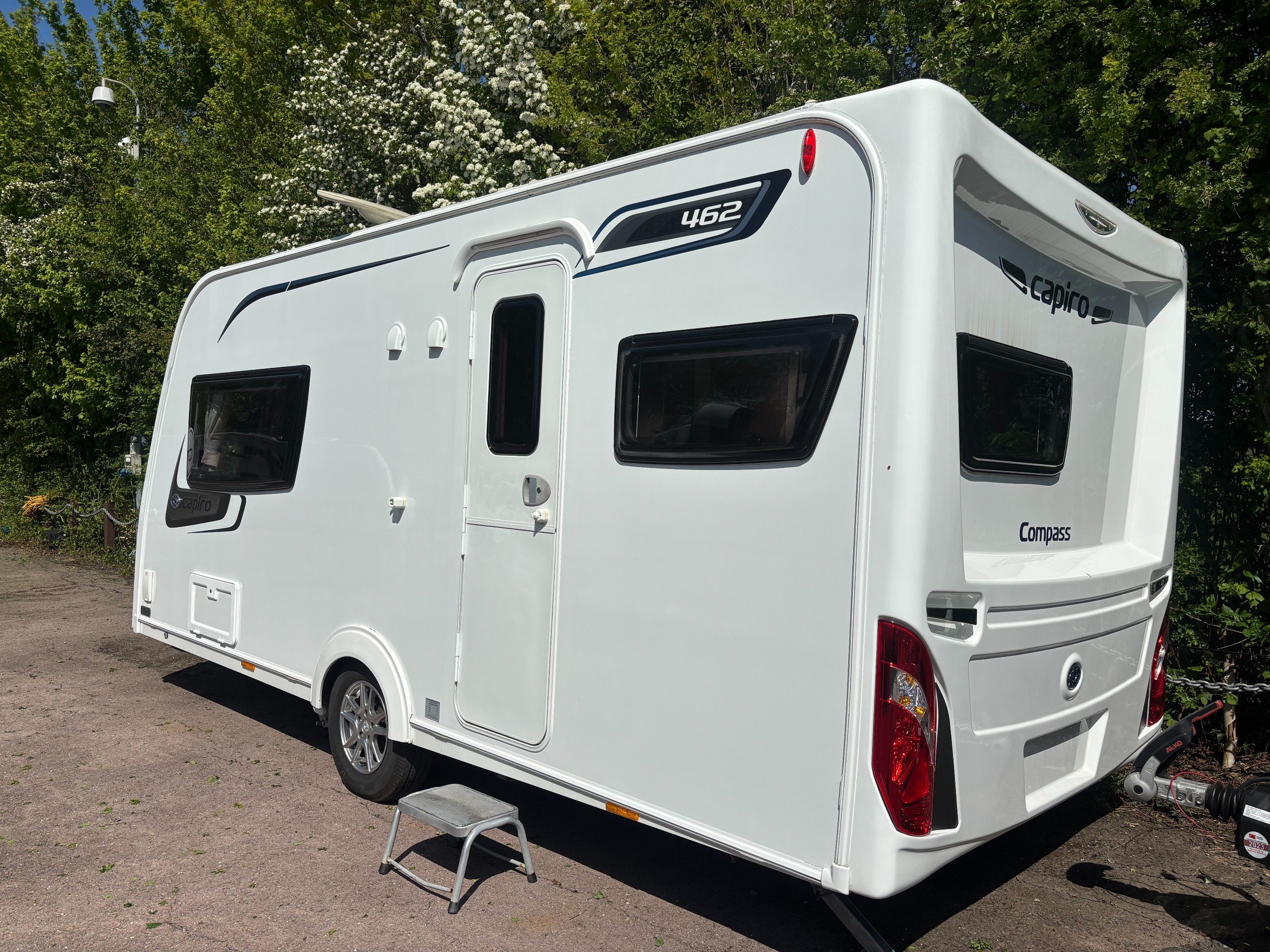 A single axle caravan with an end kitchen and fitted motor mover.