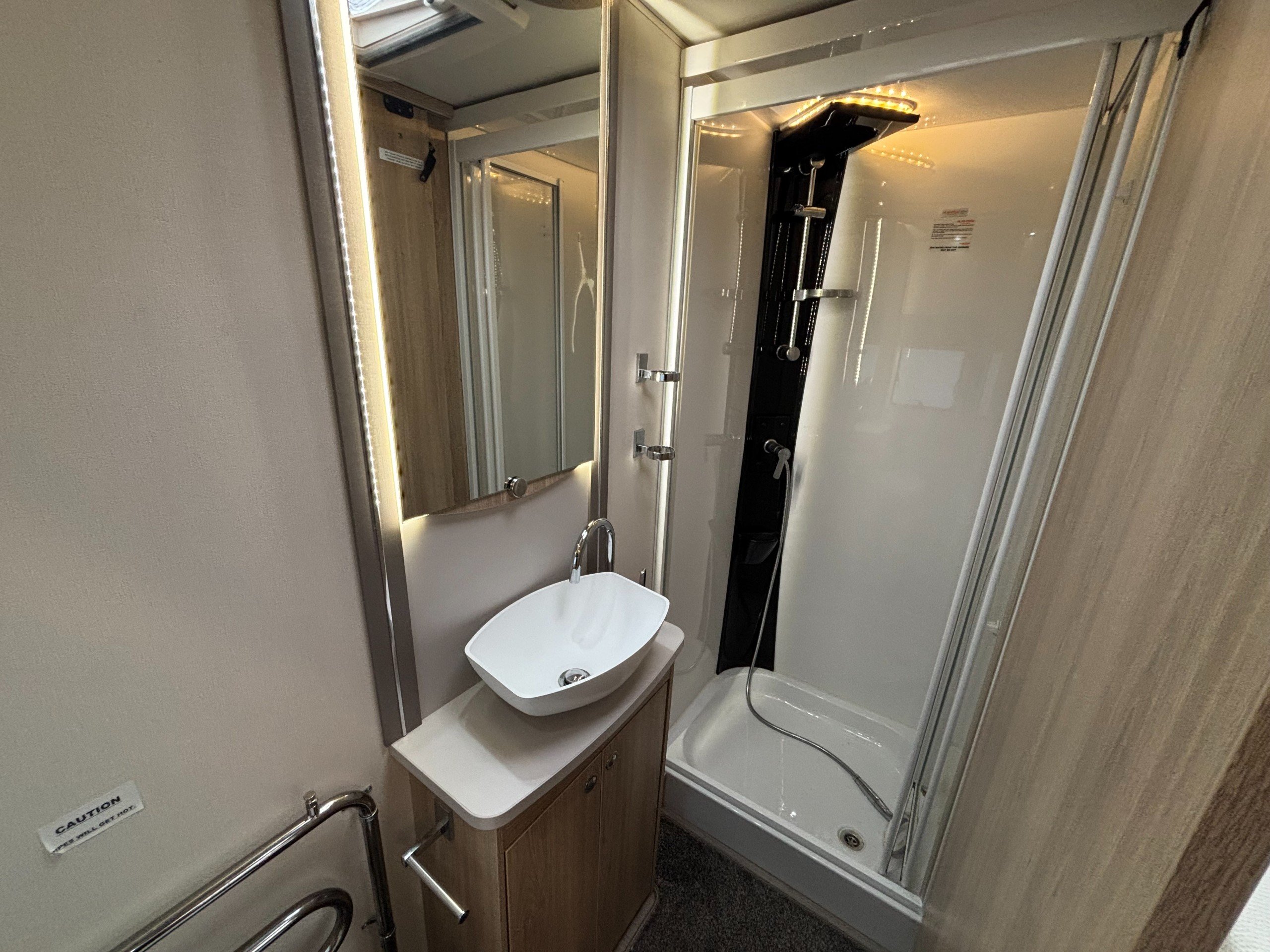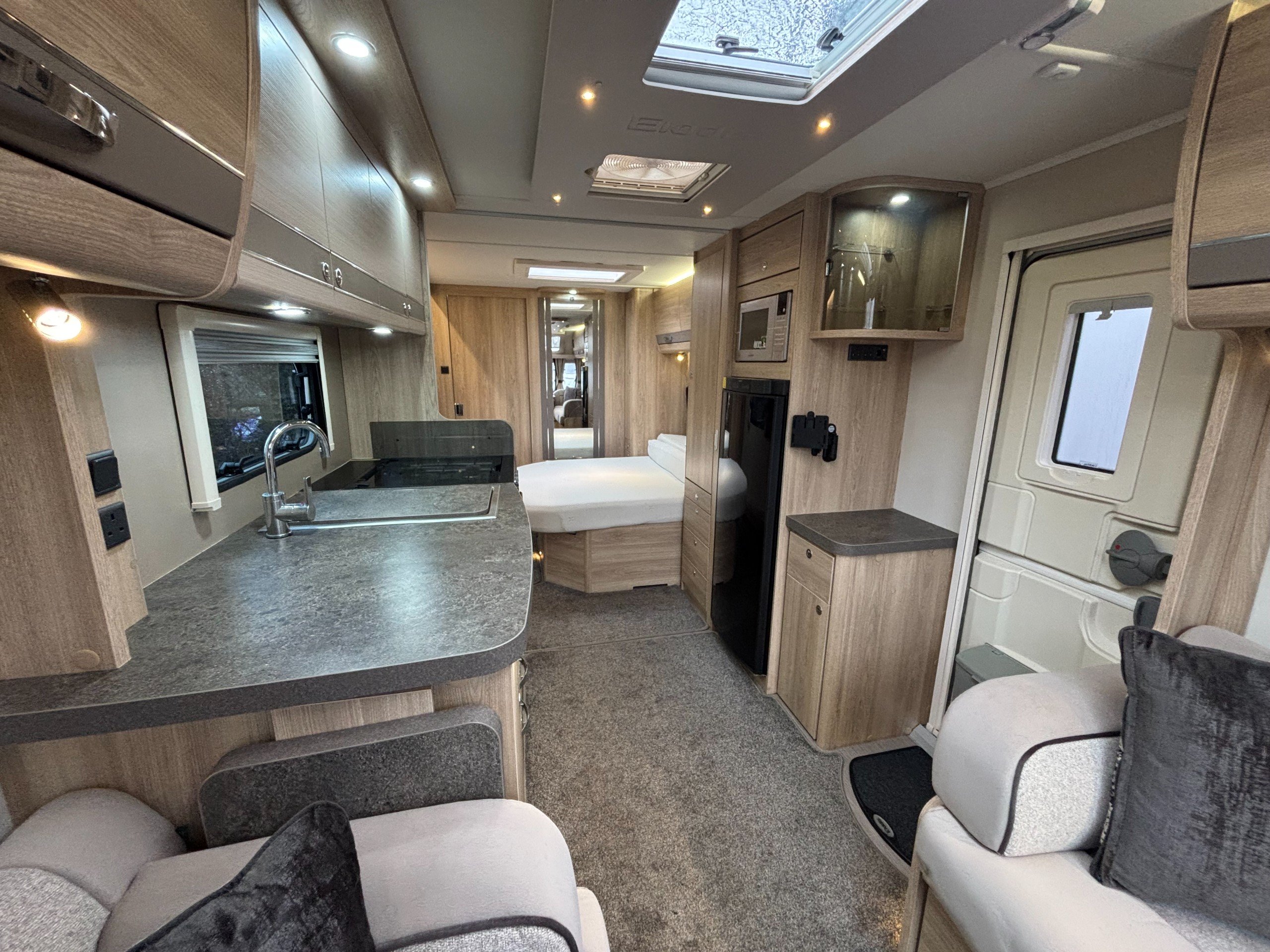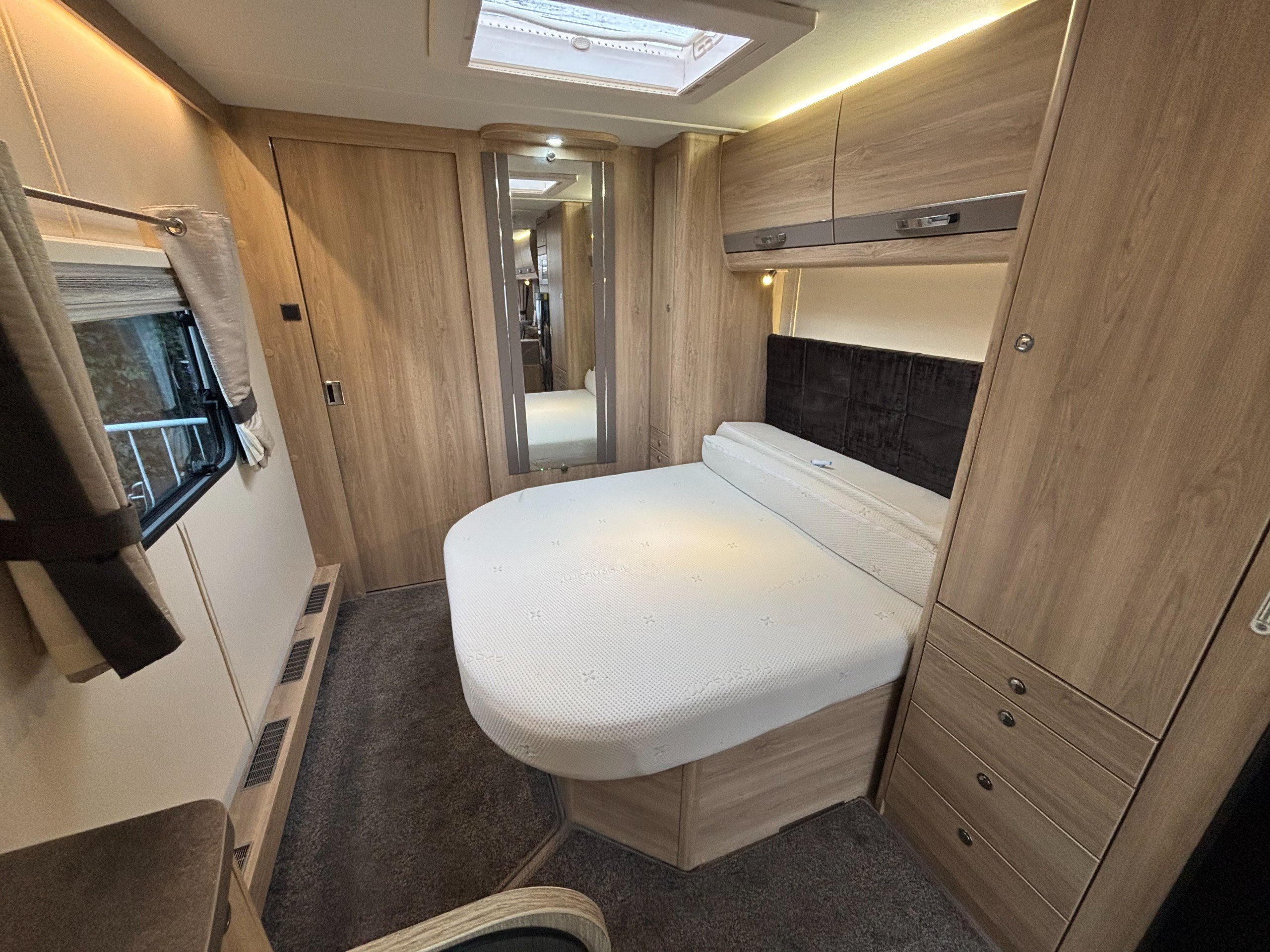 A high specification twin axle with a transverse island bed, end washroom and fitted motor mover.