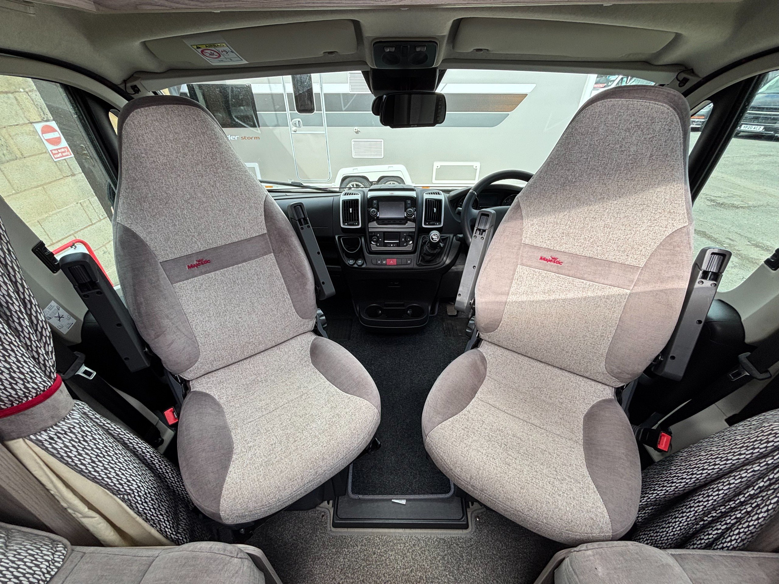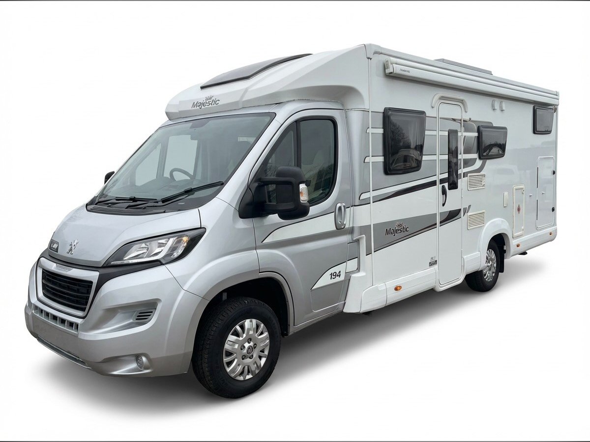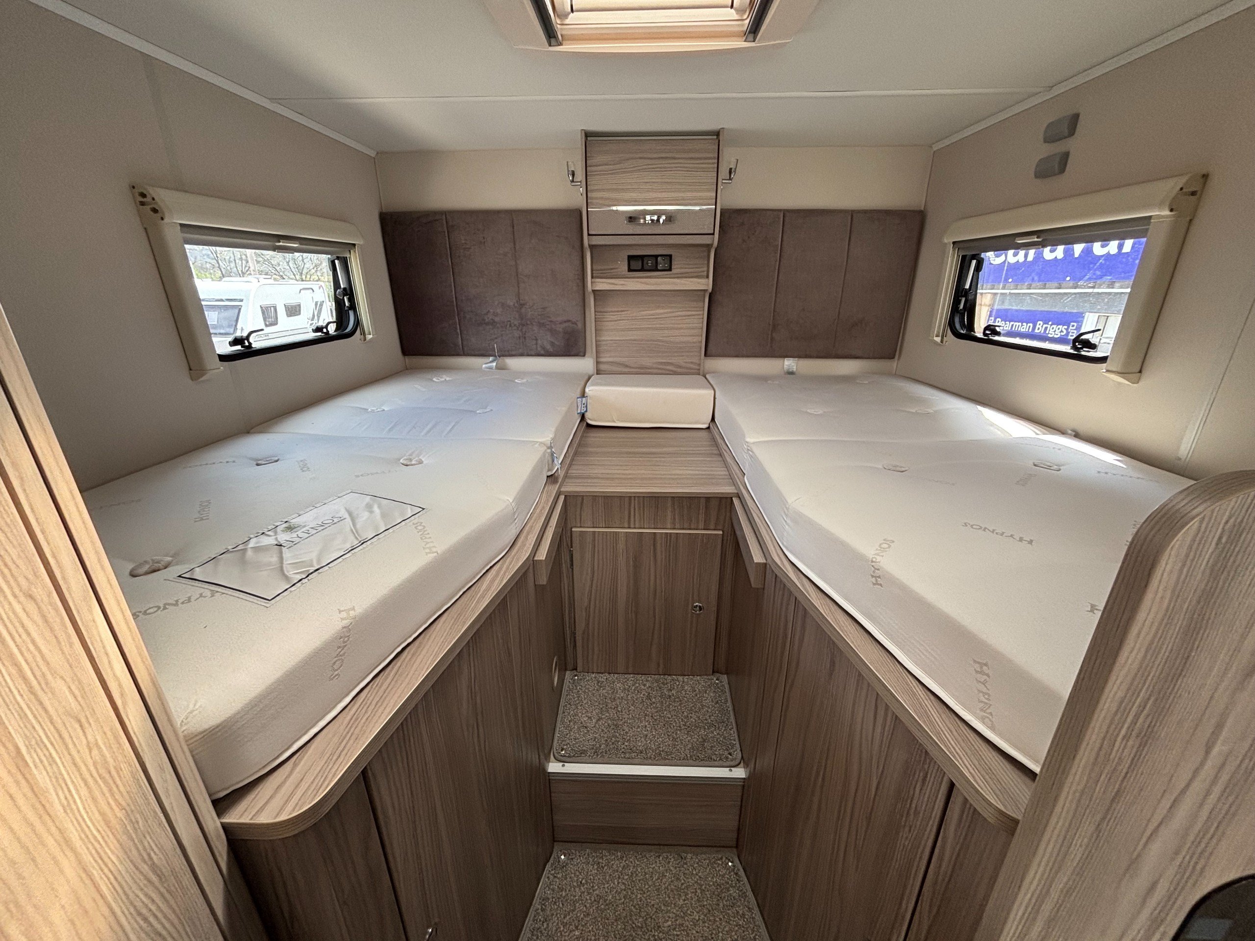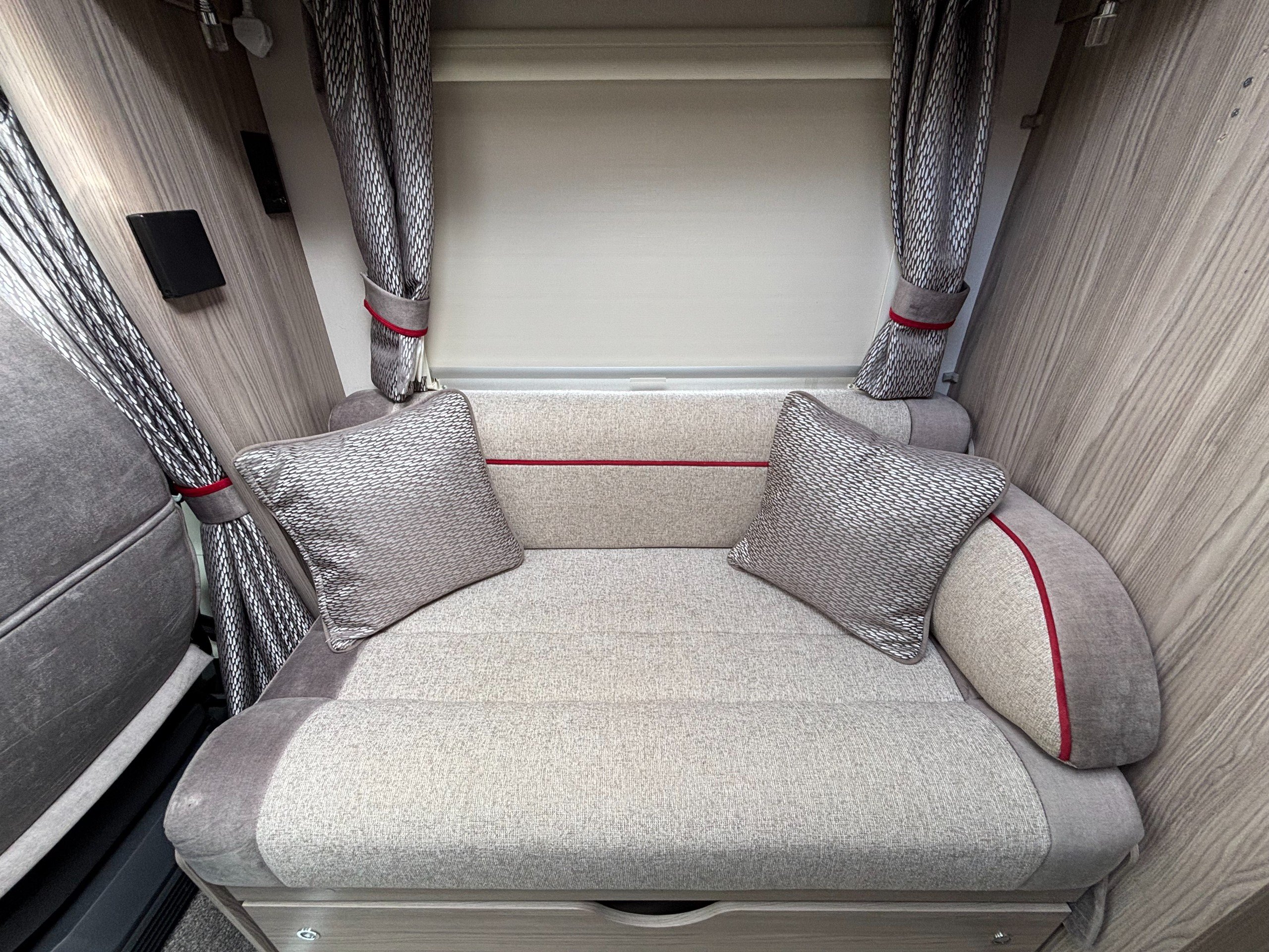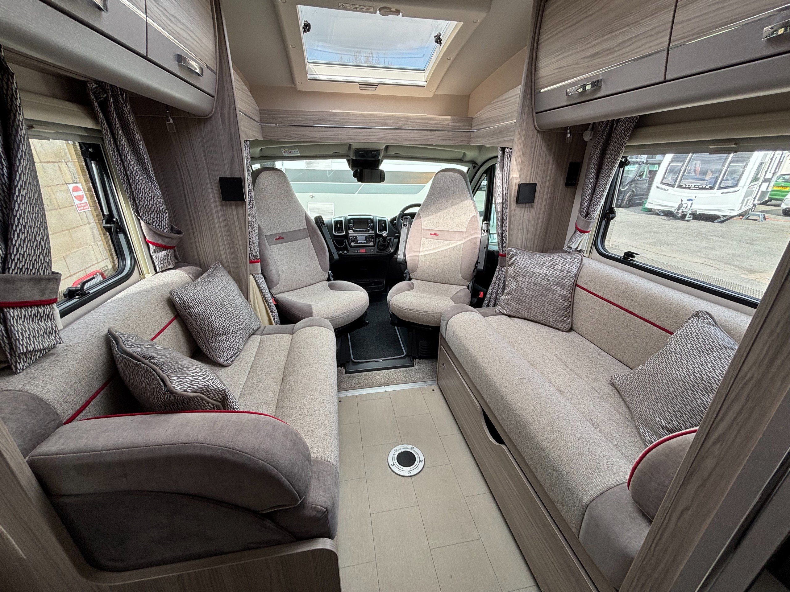 The rear of the Majestic 194 has a raised sleeping area with two single beds above a large garage. At the front, the parallel lounge seats four (with foldaway travel seats) and converts to a further double bed. A great alternative for two or four travellers.